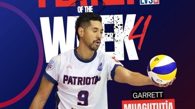Muagututia, en los dos partidos que los Patriotas de Lares disputaron esta semana, sumó la friolera de 37 puntos en 8 parciales, para un promedio de 4.63. Además, tuvo una noche destacada contra los Gigantes de Carolina, acumulando 24 puntos: 23 en ataques y 1 en bloqueo.